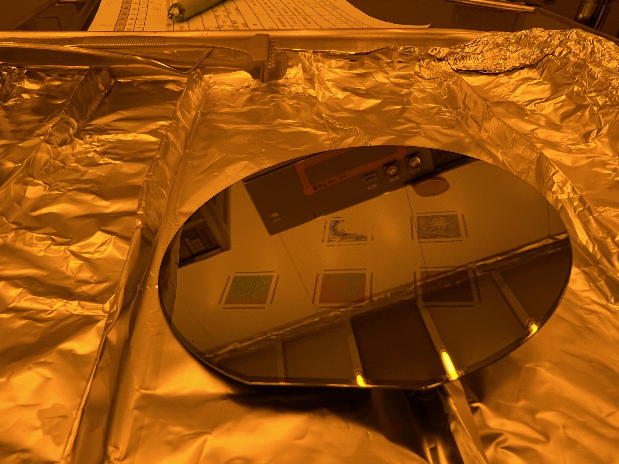 実験では、フォトレジスト塗布の工程におけるOAPの有無、露光時間、露光後のPEBの有無などにより、現像後に残るフォトレジストの膜厚や形状等に与える影響を確認しました。顕微鏡観察や膜厚測定を通じてデータを取得し、感度曲線を作成することで、フォトリソグラフィ工程への理解を深めました。