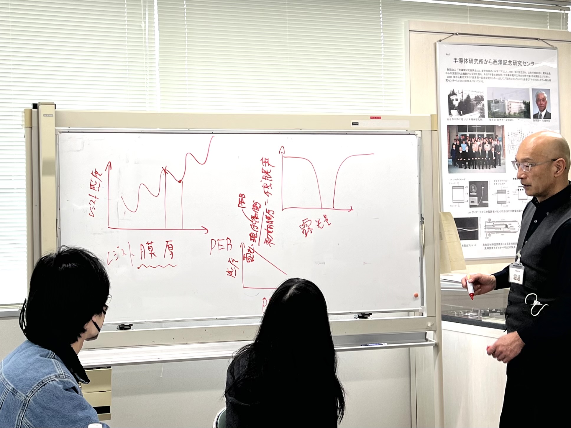 本実習には、秋田大学や福島大学の大学院生を中心に10名が参加し、フォトリソグラフィの基礎を座学で学んだ後、クリーンルームにおいて実験を行いました。